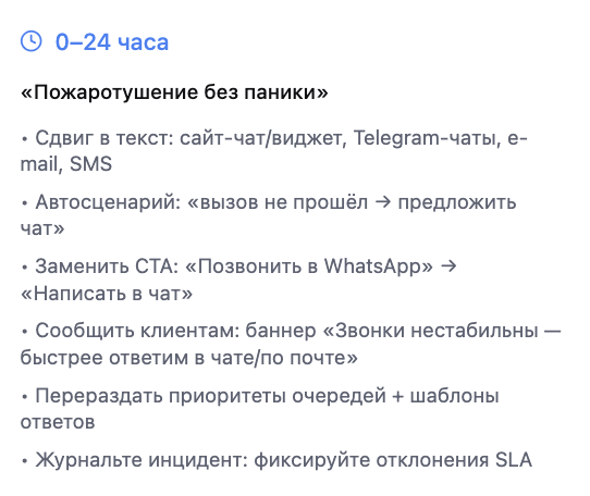 - Канальный микс «без единой точки отказа». Планируйте, будто звонков в мессенджерах нет вовсе; они — «приятный бонус», но не фундамент.