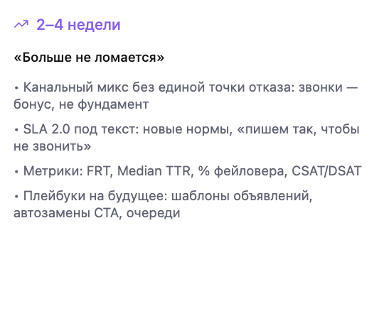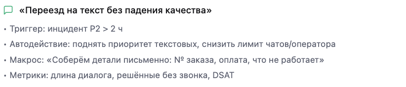 С готовыми плейбуками и макросами — в течение дня: меняются приоритеты очередей, замещаются CTA, вешается баннер, обучается команда короткому «tone of voice» для чатов.