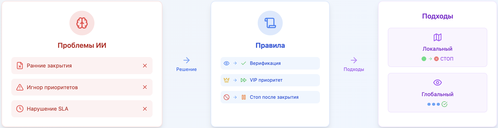 - Гибкость — при изменении регламентов обновляются только правила, а не весь ИИ.