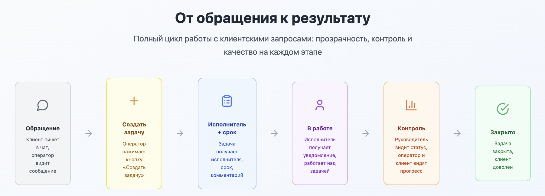 Чат — это про момент, задача — про процесс. Когда оператор оформляет из обращения задачу, он не просто «передаёт в отдел».