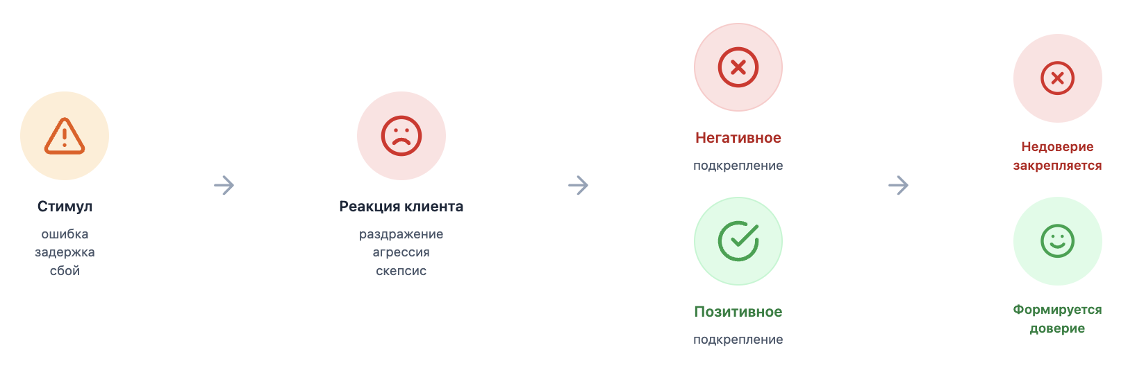 Если подкрепление негативное (медленный ответ, сухая формулировка) — привычка закрепляется: клиент ждёт худшего. Если подкрепление позитивное (эмпатия, быстрые действия) — формируется новый опыт: клиент доверяет и остаётся.